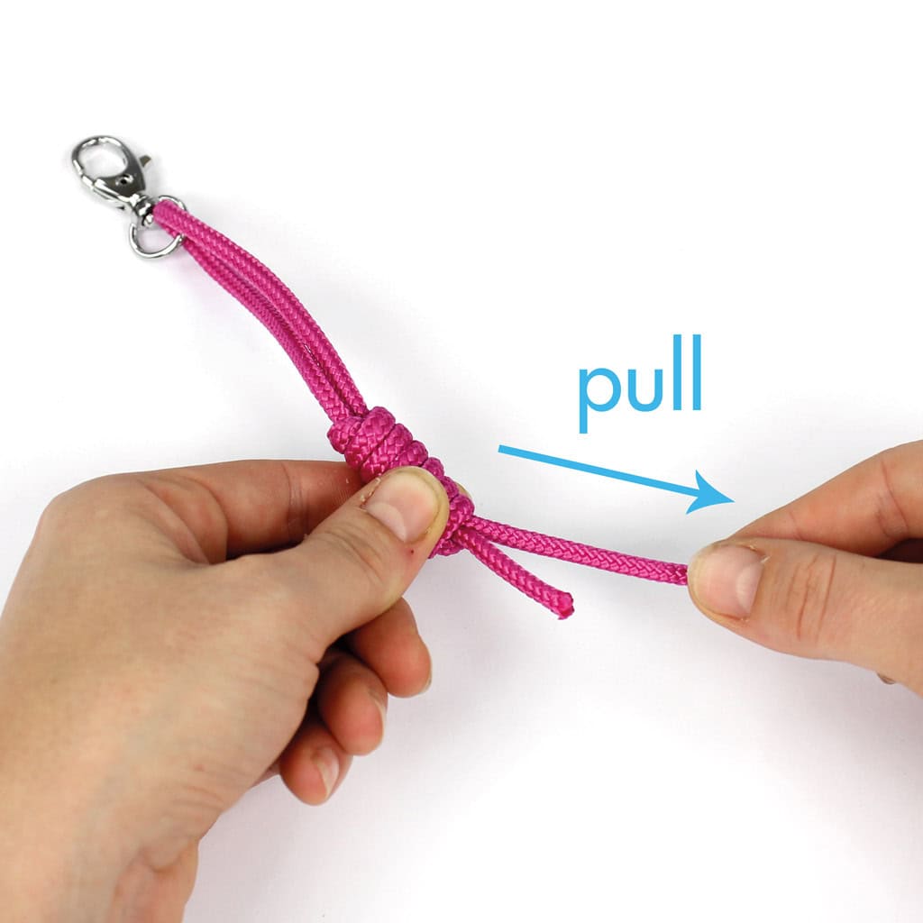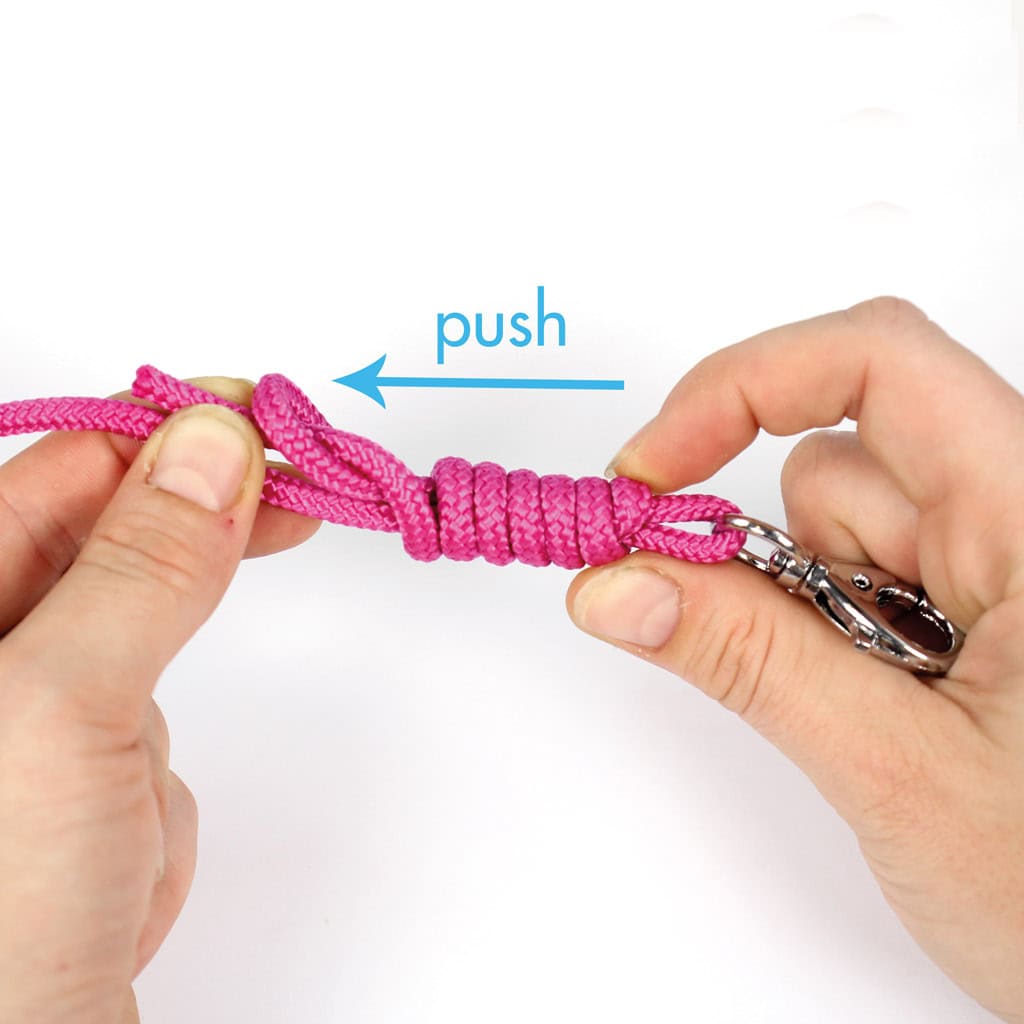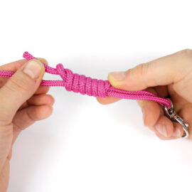 Finally, pull on the long rope to make the upper loop (where the snap hook sits) smaller. A loop height of about ½–1″ (2–3 cm) looks neat and holds well.