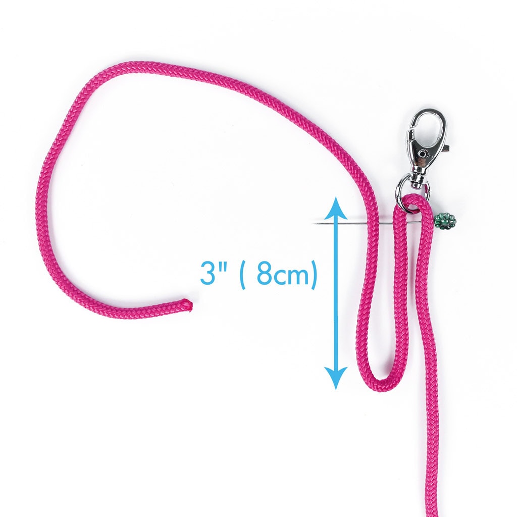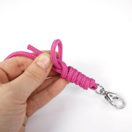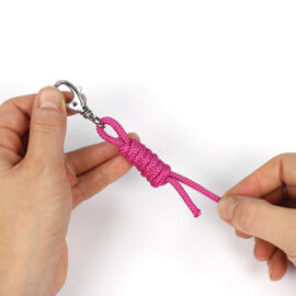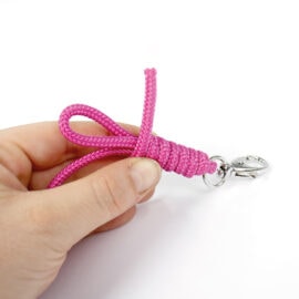 Cut a 40″ (100 cm) piece of rope. If using PP rope, seal both ends with a lighter to prevent fraying. Slide a snap hook with a round eye onto the rope and position it about 16″ (40 cm) from one end. Secure the two rope strands just below the snap hook with a pin or clip. Then lay both strands straight down. After about 3″ (8 cm), bend the shorter end back up to form a small loop pointing toward the snap hook. Hold all three strands just below the snap hook. Wrap the shorter end tightly around all three strands, starting directly under the snap hook, until about 2″ (5 cm) of the short end remains. A small loop should still be visible at the bottom.