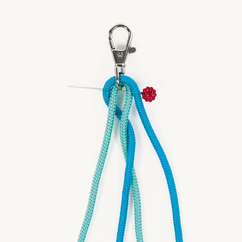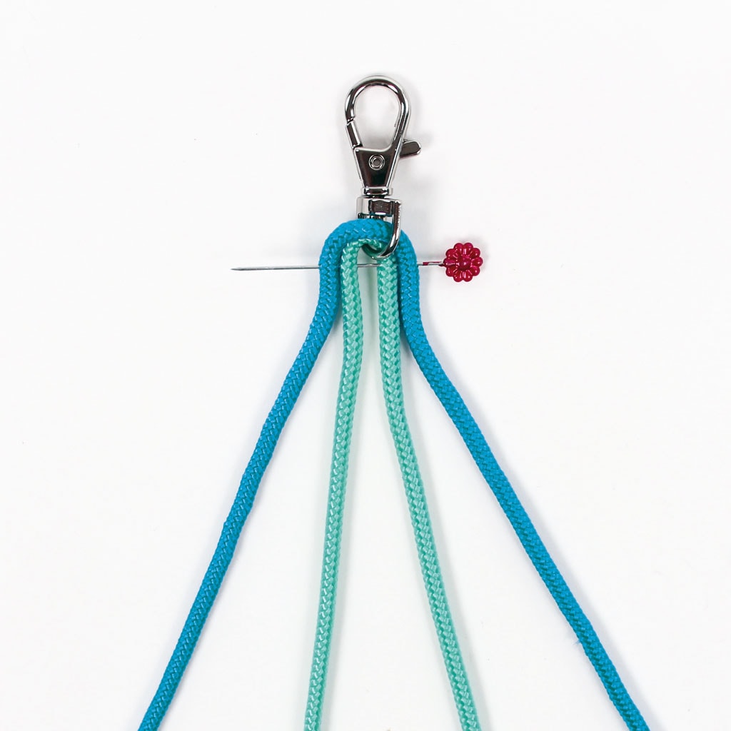 Slide a snap hook onto both ropes and position it exactly in the middle. Secure the ropes just below the snap hook with a pin so nothing can slip. For easier braiding, arrange the ropes in the order color 1 – color 2 – color 2 – color 1, so the two middle strands are the same color.