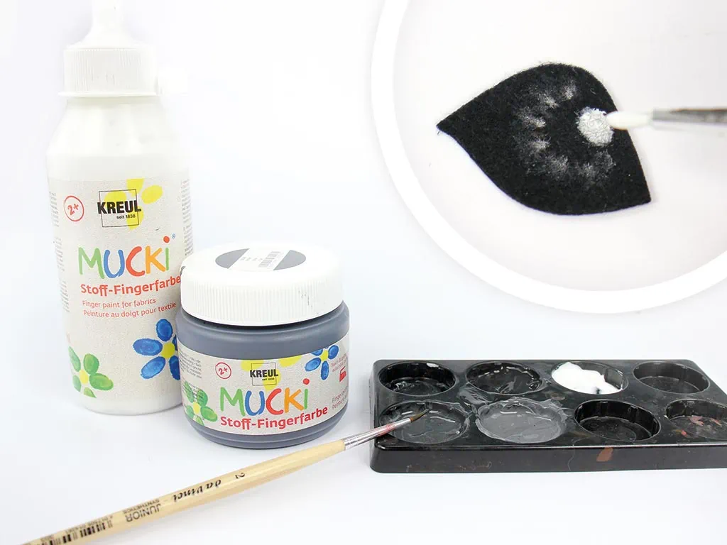 It is best to use a high-quality fabric paint. We use “MUCKI fabric finger paint” or “Creall Tex fabric paint” as they are tested for harmful substances, but you can check what your local craft store has in stock. You will also need a thin, pointed brush so that you can paint on the small details precisely, a color mixing palette and of course the eye shape cut out of black felt.