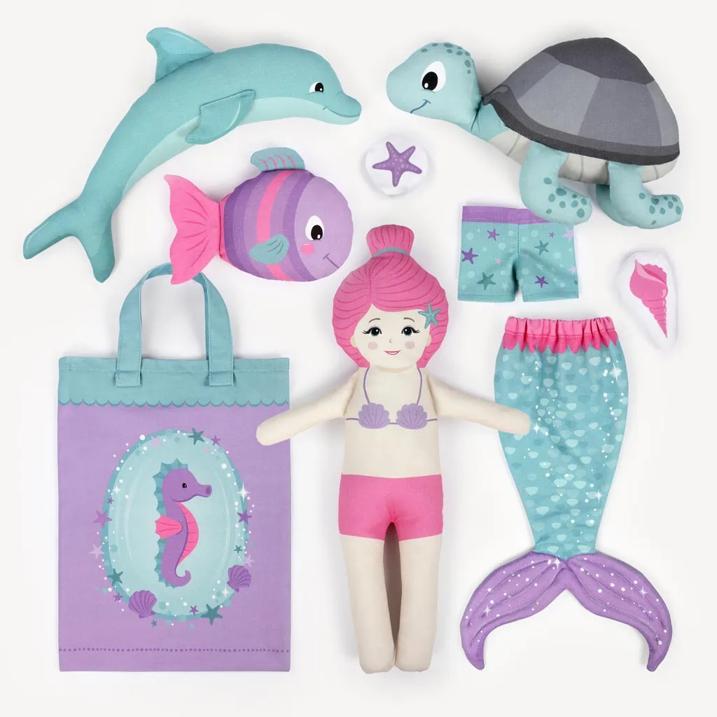 - Included sewing projects: doll / mermaid NALANI, clothes for the doll (1x mermaid tail & 1x shorts), turtle FLINKY, dolphin KEKE, fish BOBBI, small sea creatures (1x starfish, 1x seashell), pouch bag with handles