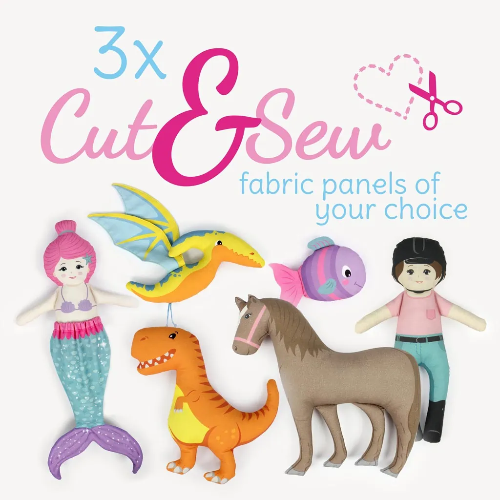 With this product you can choose any three of our colorful cut n sew fabric panels and get a 15% discount! You can choose three different motifs, but also two or three times the same motif. So you can perfectly match the set to the preferences of your children or grandchildren, regardless of whether you have horse, mermaid or dinosaur fans at home 🙂