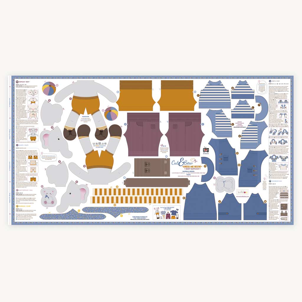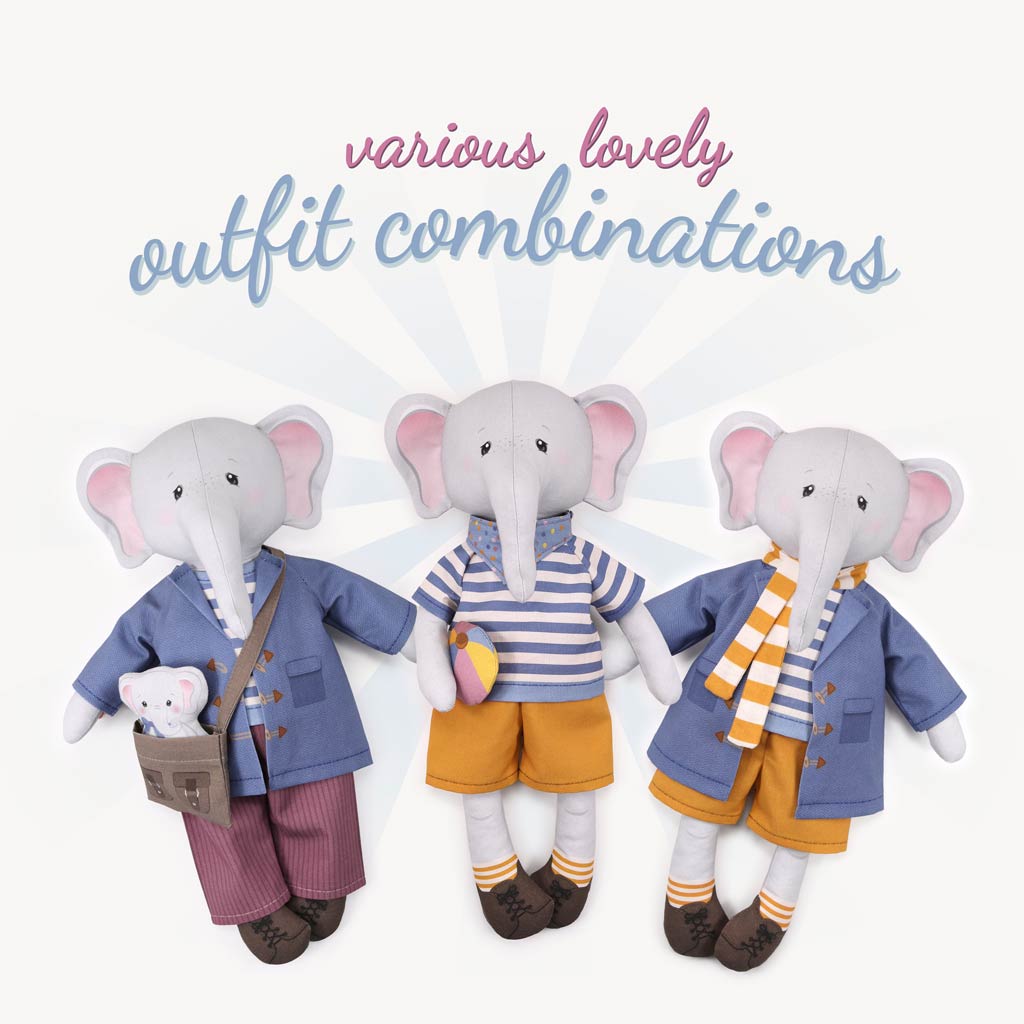Tip: If you enjoy sewing rag dolls and rag doll clothes, check out our other cut and sew doll farbric panels from this series, e.g. cute BETSY BEAR. You can combine all Eddy Elephant and Betsy Bear clothing and accessories as they fit both dolls! We also offer digital sewing patterns for additional clothes and accessories for your Dress Me Bestie, so check our shop.