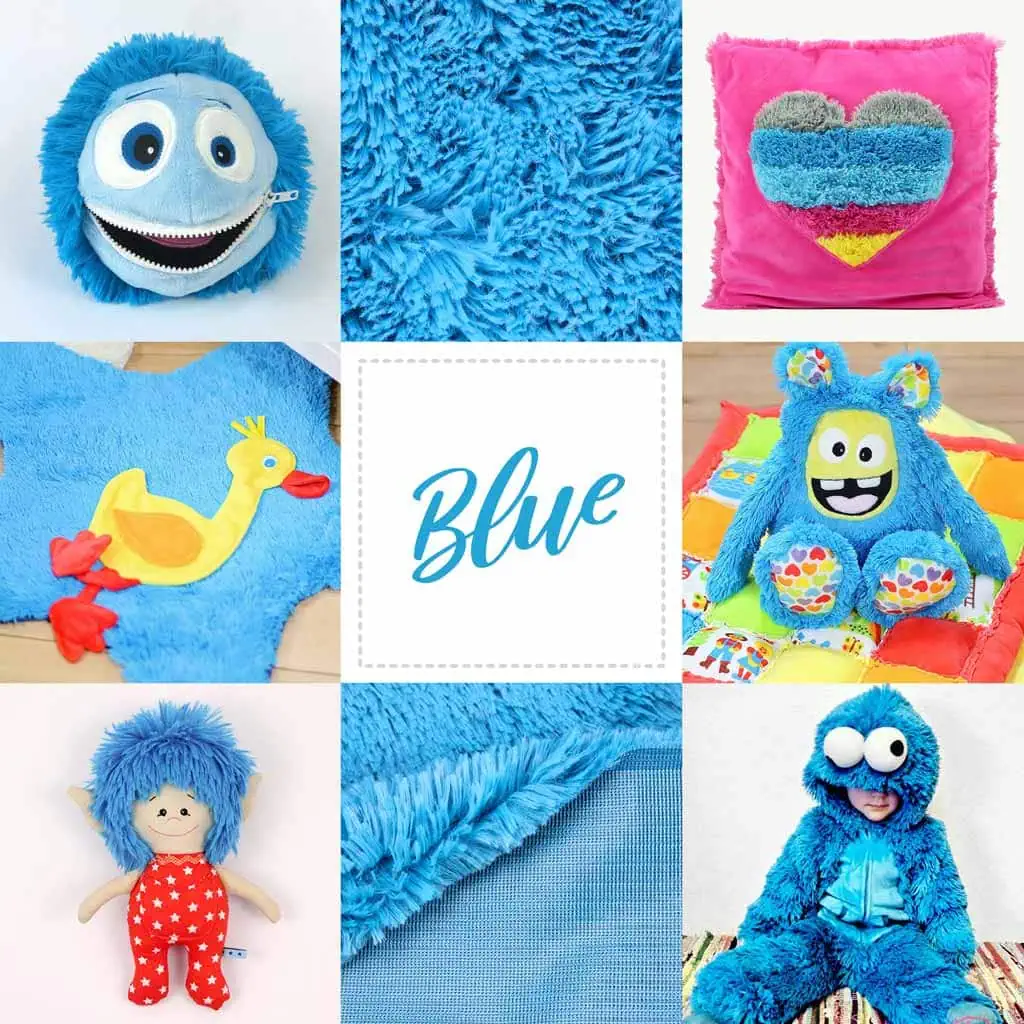 What’s great: you can also combine our long-piled plush SHAGGY with our short-piled plush SHORTY! The colors of both plush types are coordinated with each other. For example, we love to combine our SHORTY blue or yellow with this blue SHAGGY fabric, but check our shop for more color matching short pile plush fabrics!