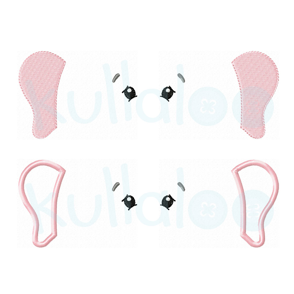- Embroidery patterns to fit a 4×4″ hoop for eyes, eyebrows and inner ears, in two different versions, in which the inner ear is embroidered with either a fill stitch or as an applique with fabric