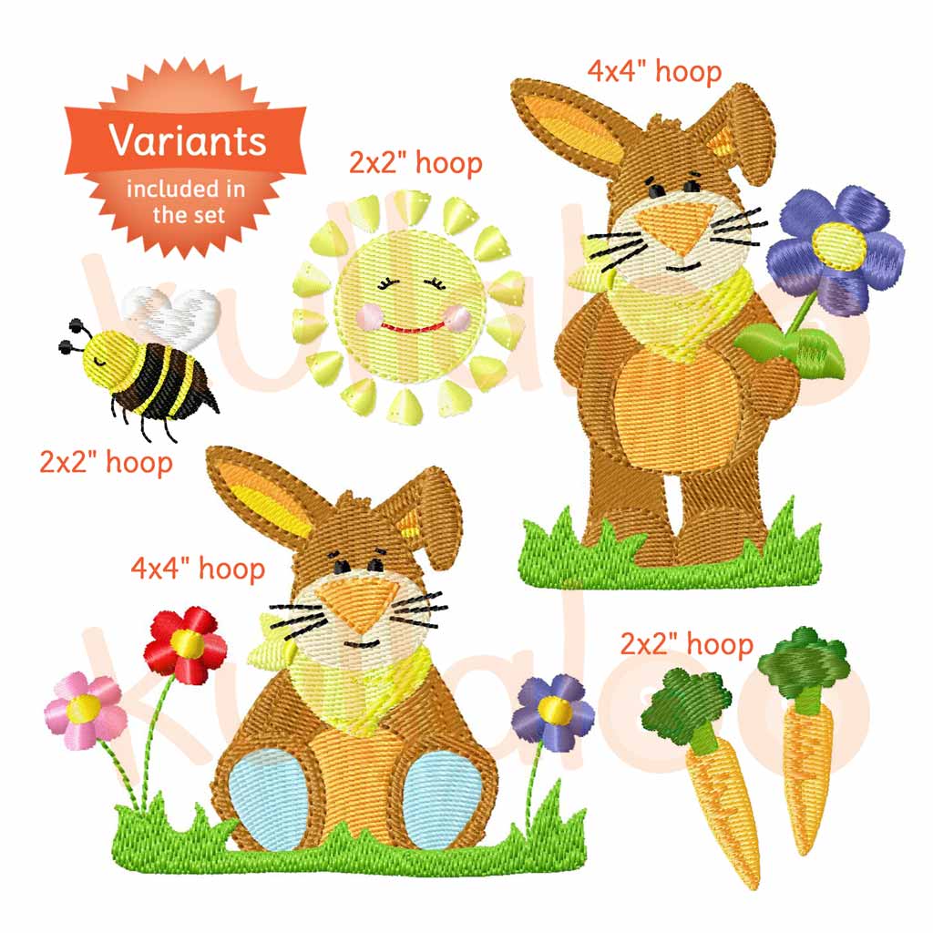 We designed the two bunny embroidery files for a 4×4″ hoop (10×10 cm). The small decorative elements fit into a 2×2″ hoop. All files are digitized in the common formats DST, EDR, EXP, HUS, INF, JEF, JEF +, PCS, PES, TAP, VIP, VP3, XXX. After purchase and payment you can download the embroidery file set including color charts packed in a .ZIP file.