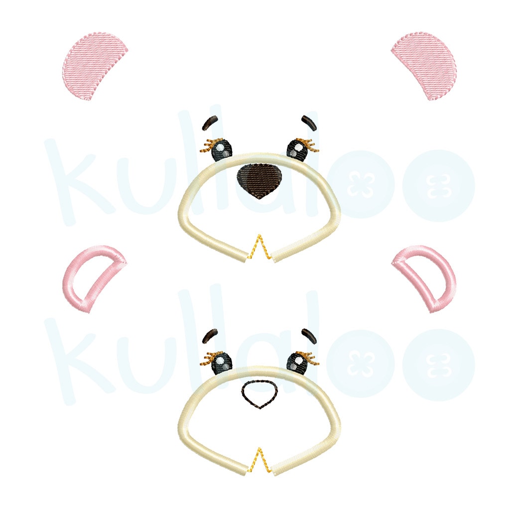 - Embroidery patterns to fit a 5×7″ hoop for muzzle, eyes, eyelashes, eyebrows, nose and inner ears, in two different versions, in which the nose and inner ears are embroidered with either a fill stitch or as appliques with fabric
