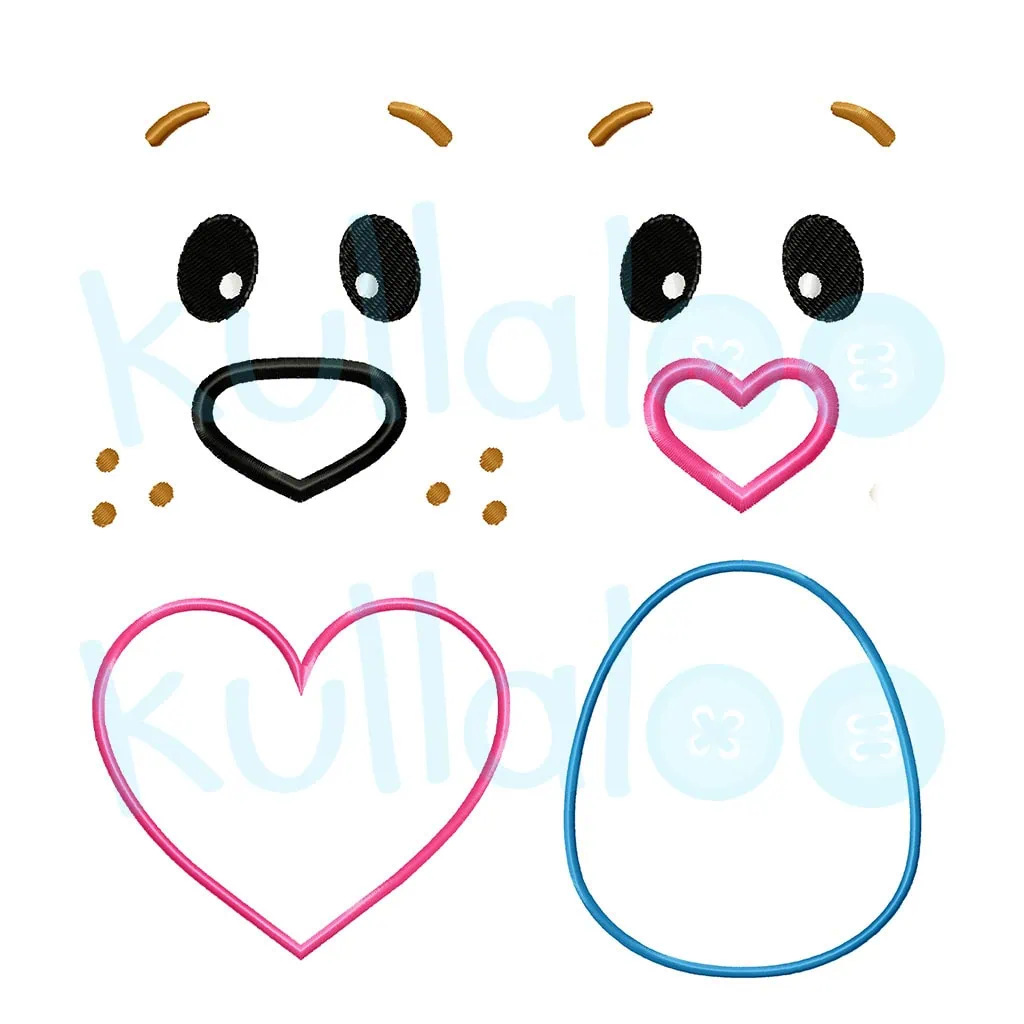 - Embroidery patterns for eyes (left and right, including eyebrows), oval and heart-shaped noses including whiskers, and oval and heart-shaped bellies, in the file formats DST, EDR, EXP, HUS, INF, JEF, JEF+, PCS, PES, TAP, VIP, VP3, XXX