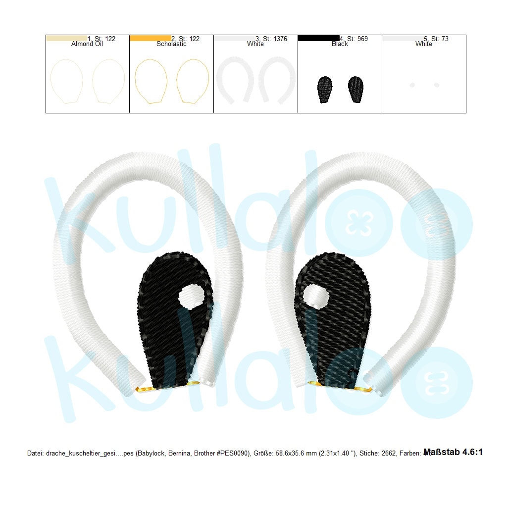 If you have an embroidery machine, you can use this embroidery file to embroider the eyes of the dragon instead of sewing them as appliqués with a sewing machine or by hand (as described in the sewing instructions). The embroidery file is designed for a 4×4″ hoop (10×10 cm) and digitized in the common formats DST, EDR, EXP, HUS, INF, JEF, JEF+, PCS, PES, TAP, VIP, VP3, XXX. After purchase and payment you can download the dragon embroidery file including a color chart packed in a .ZIP file. You will also receive an illustrated embroidery instruction as a PDF file.
