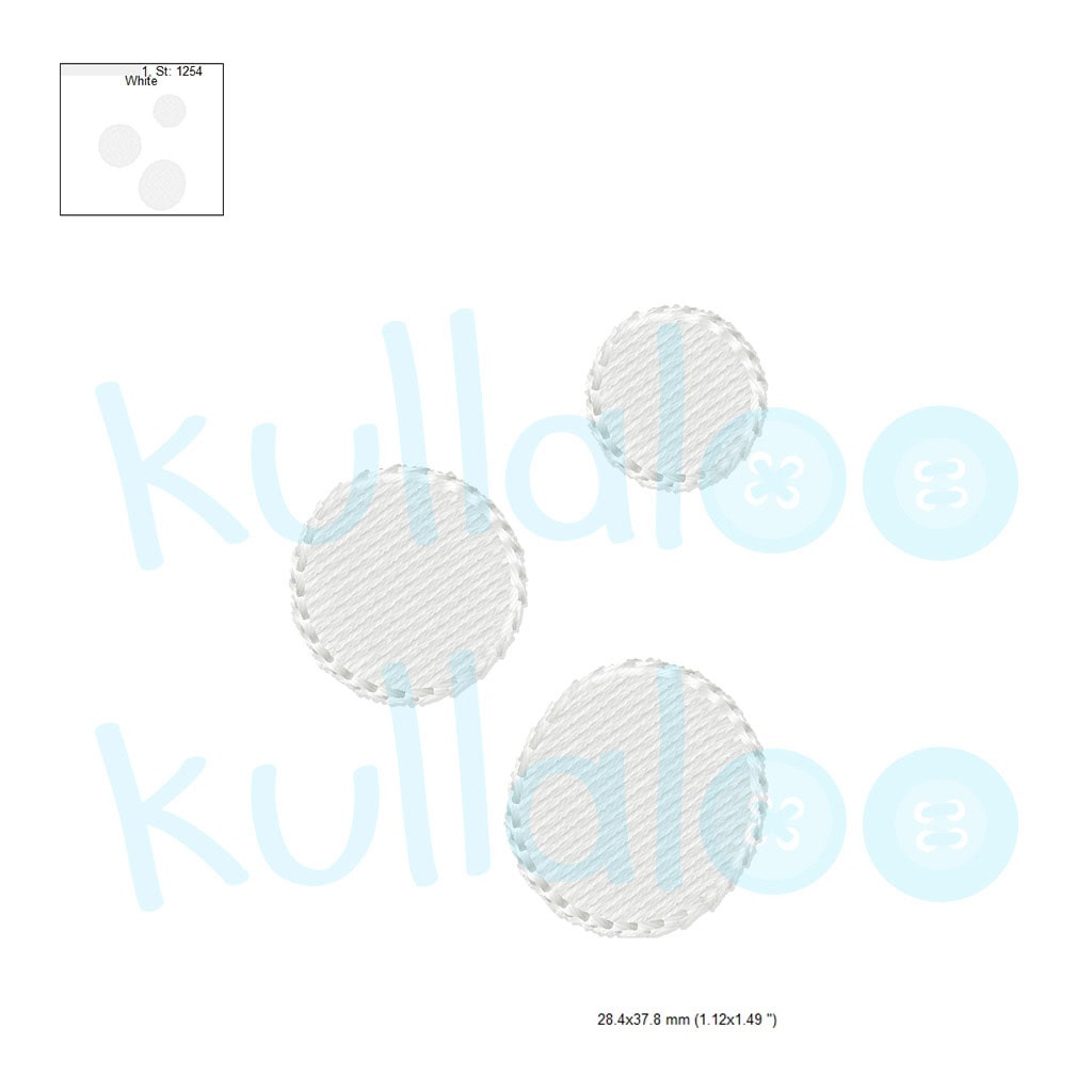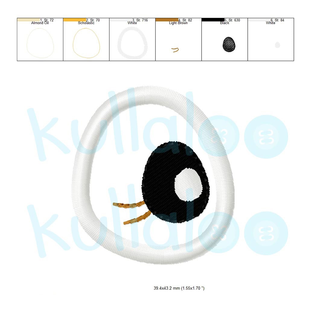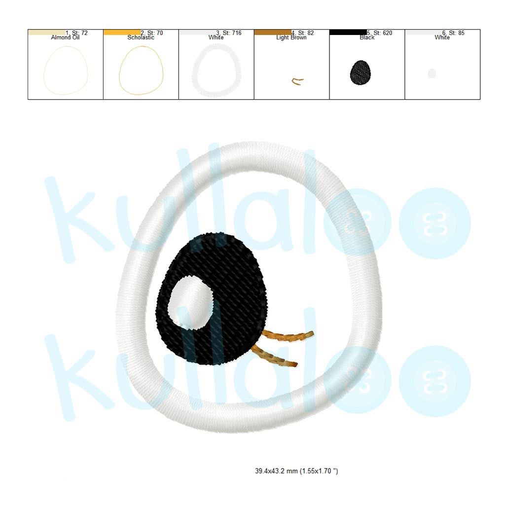 - 2 embroidery designs for the eyes and 3 for the white spots, in the file formats DST, EDR, EXP, HUS, INF, JEF, JEF +, PCS, PES, TAP, VIP, VP3, XXX