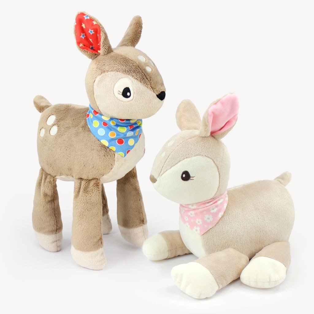 You can sew the deer or fawn with various fabrics, but we recommend a slightly stretchy, medium-weight plush fabric for best results. Sewing experience is a must as the reindeer pattern is for intermediate skill level. It takes about 4-5 hours to sew the deer or fawn.