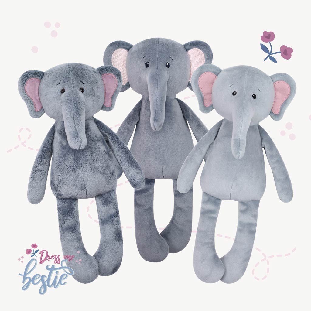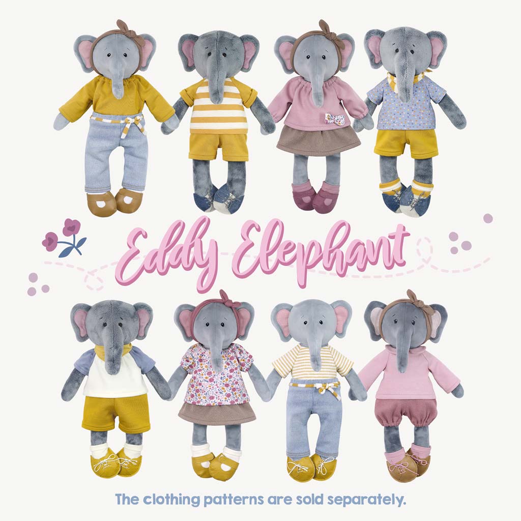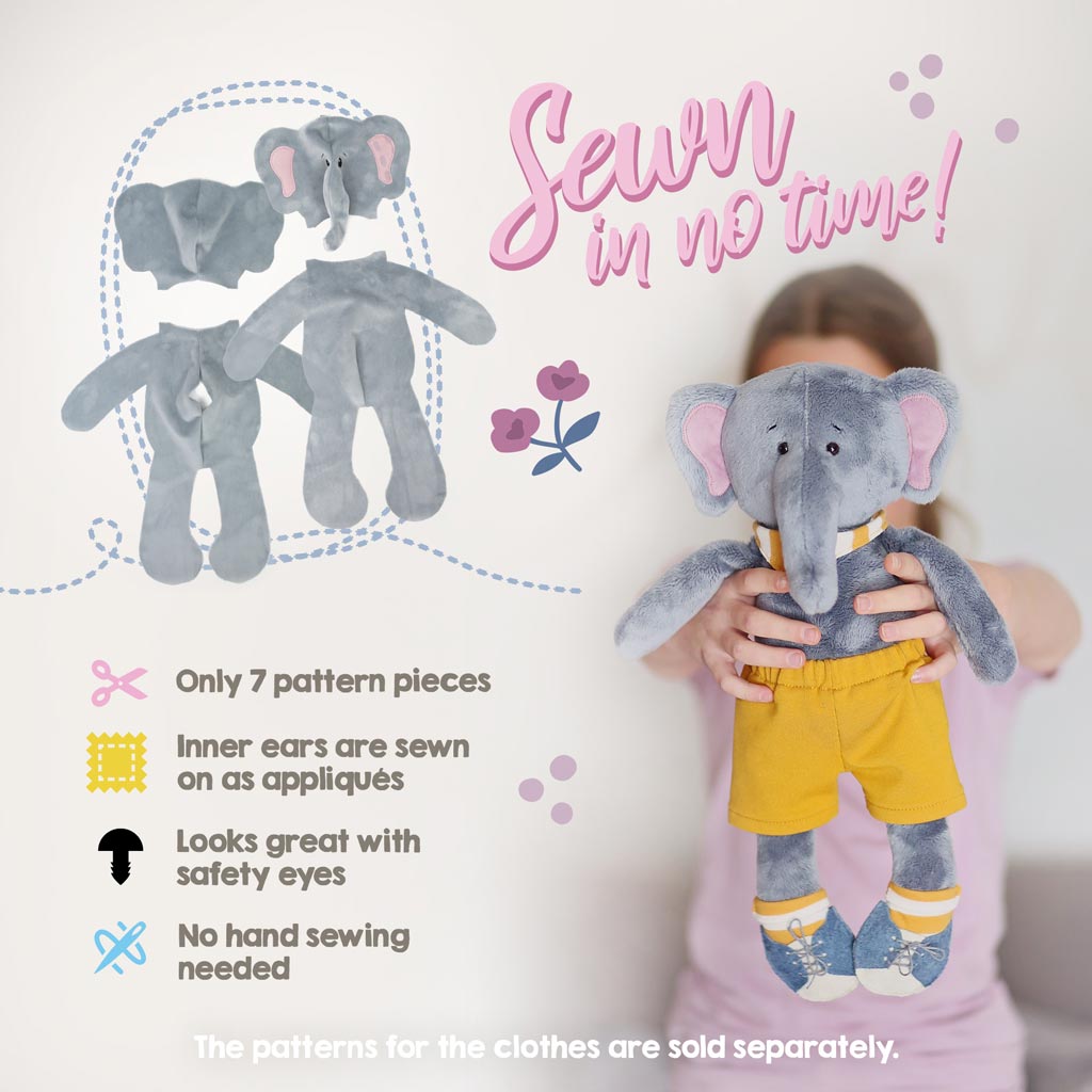 Dress Me Bestie is the name of our sewing pattern series which is all about dressing self-sewn cuddly friends. Elephant EDDY is 16 inch (40 cm) from head to toe and one of the characters for whom you can sew matching clothes and many great accessories – and all of them are interchangeable between the characters in the series! To sew the stuffed elephant, you should have a little sewing experience and 2-3 hours of time.