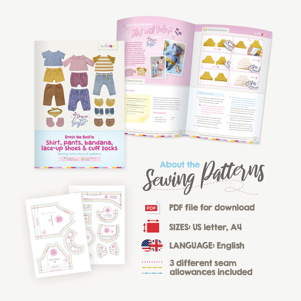 - 1 PDF file with illustrated sewing instructions and the patterns for shirt, pants, bandana, lace-up shoes and cuff socks (language: English, size: US letter)