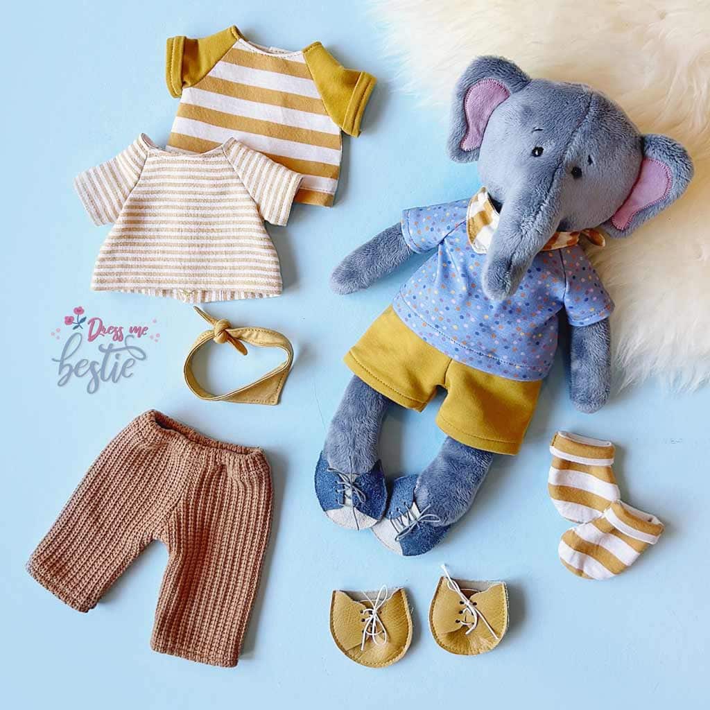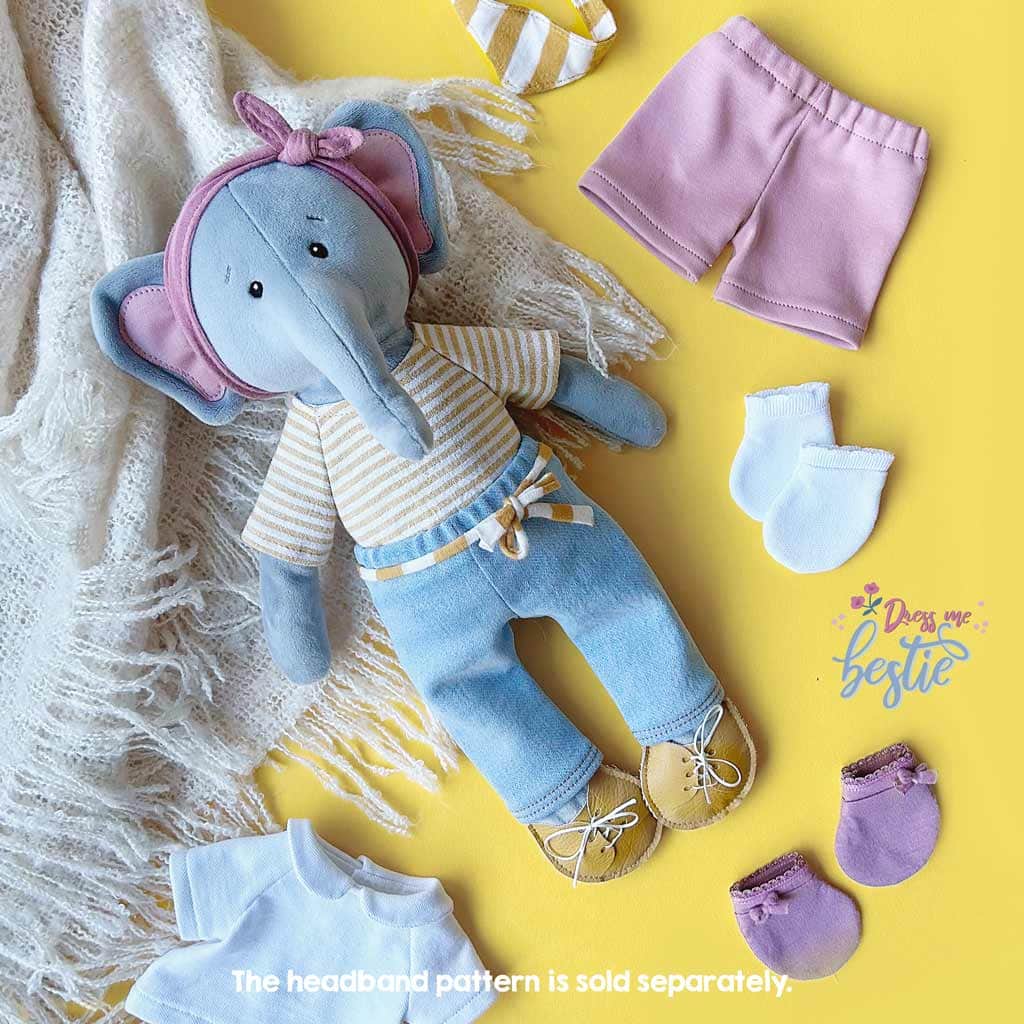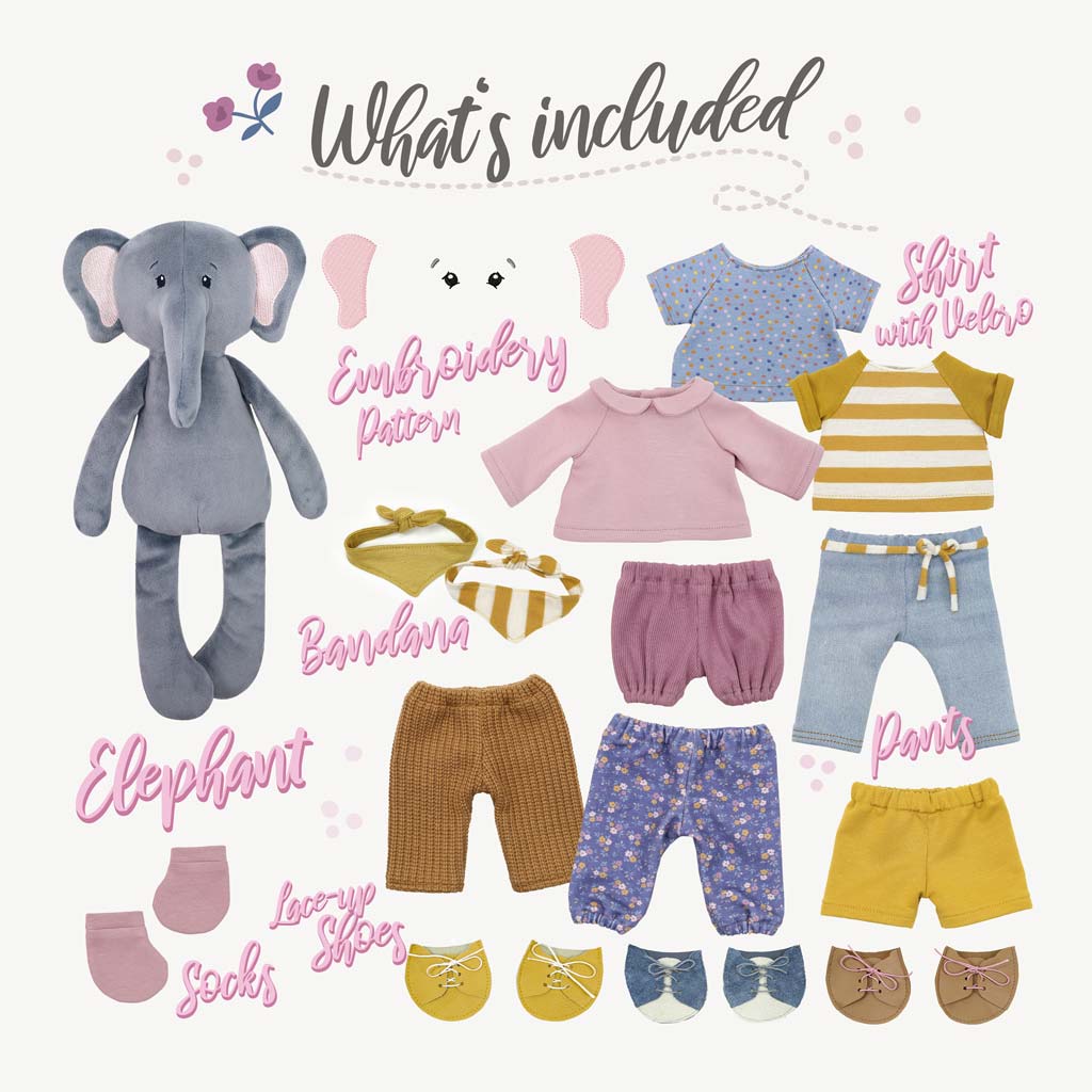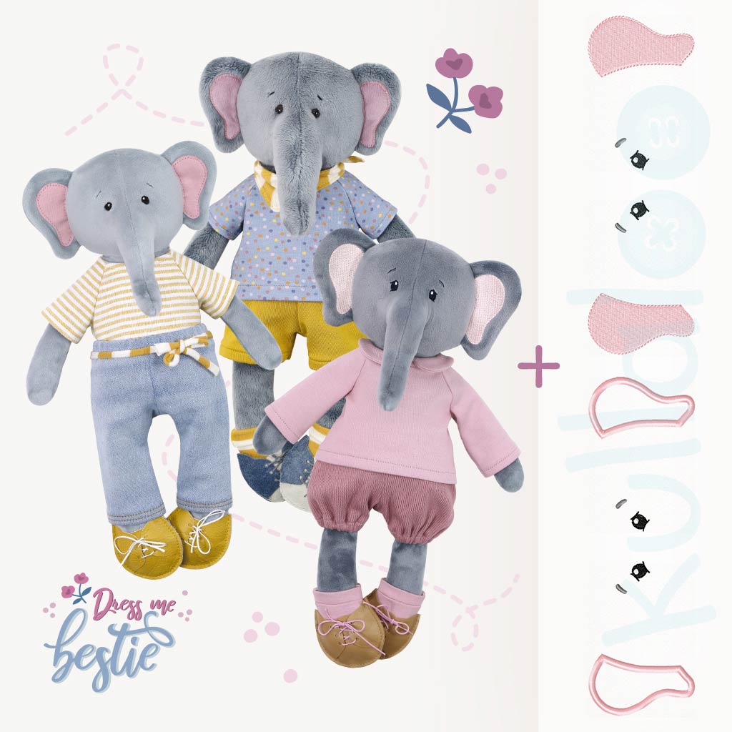 Dress Me Bestie is the name of our sewing pattern series which is all about dressing self-sewn cuddly friends. Elephant EDDY is 16 inch (40 cm) from head to toe and one of the characters for whom you can sew matching clothes and many great accessories – and all of them are interchangeable between the characters in the series! To sew the stuffed elephant, you should have a little sewing experience and 2-3 hours of time.