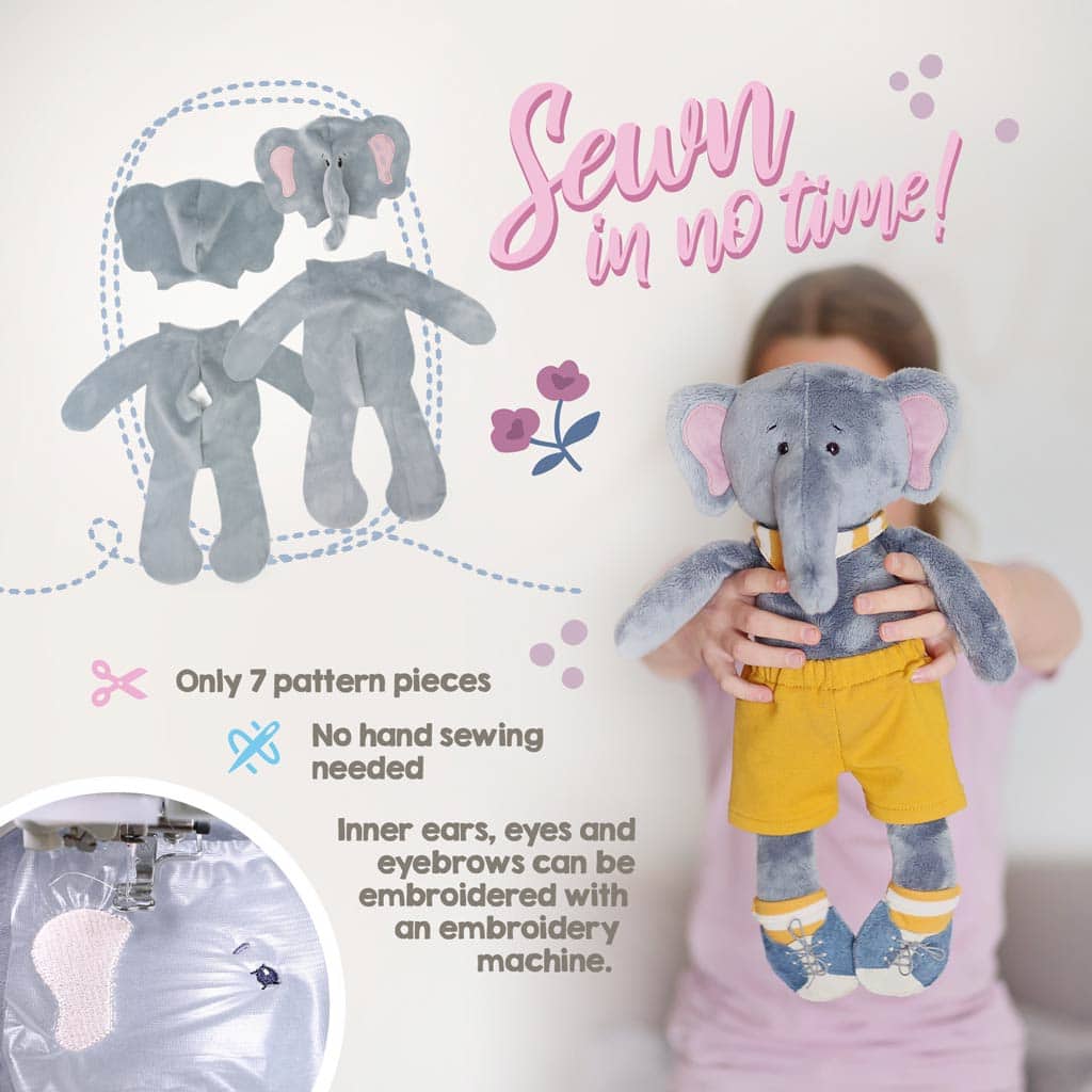 - 1 PDF file with illustrated sewing instructions and the elephant soft toy pattern (language: English, size: US letter)