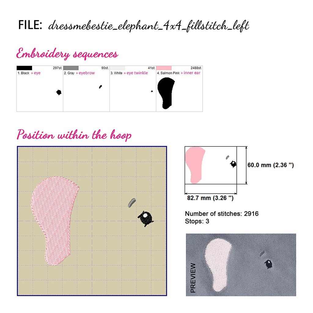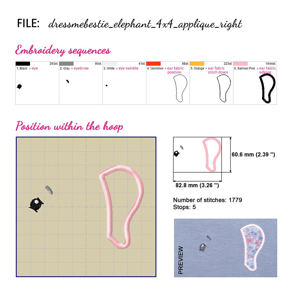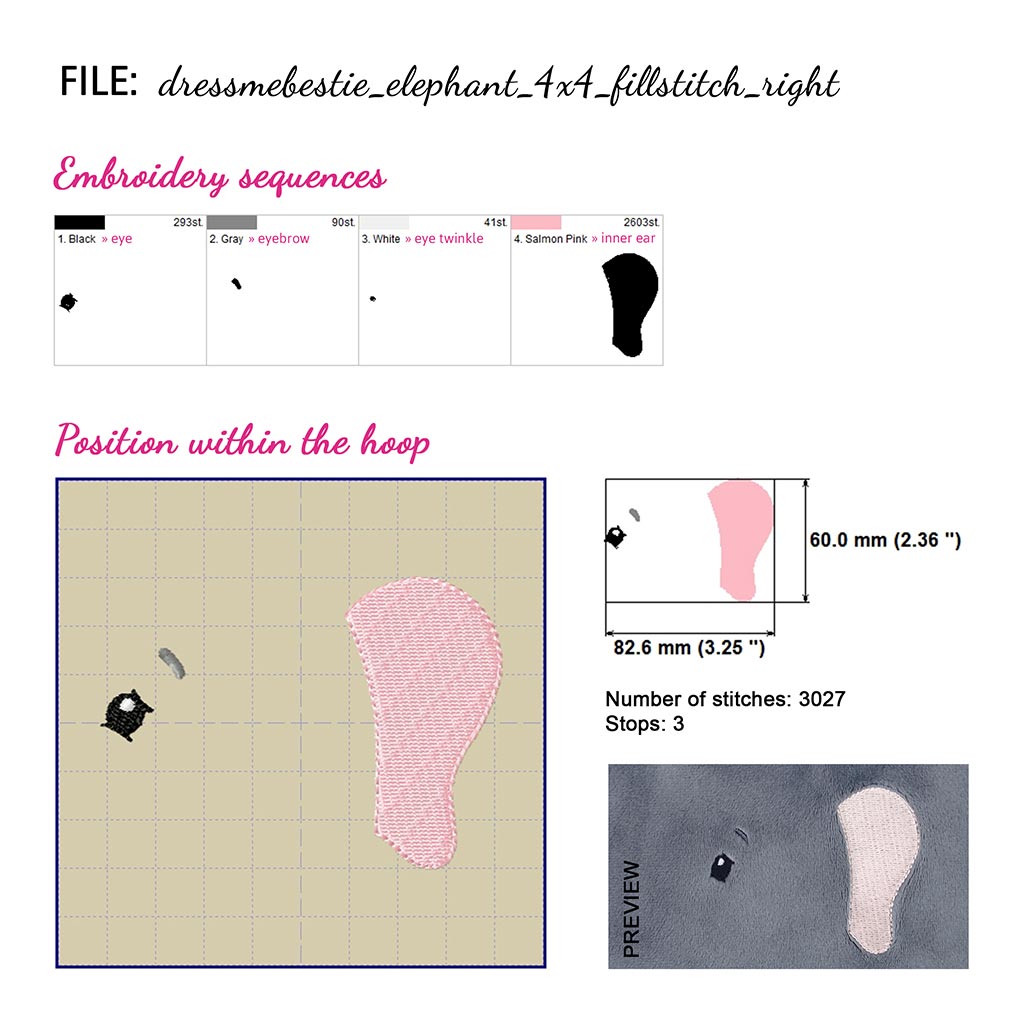 The embroidery files fit a 4×4″ hoop (10×10 cm) and are digitized in the common formats DST, EDR, EXP, HUS, INF, JEF, JEF +, PCS, PES, TAP, VIP, VP3, XXX. After purchase and payment you can download the elephant embroidery files including color charts packed in a .ZIP file. You will also receive an illustrated embroidery instruction as a PDF file.