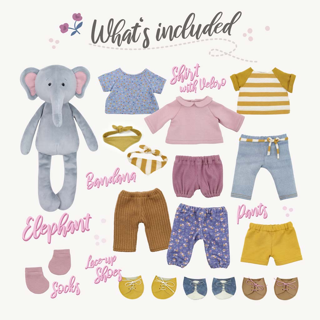 Dress Me Bestie is the name of our sewing pattern series which is all about dressing self-sewn cuddly friends. Elephant EDDY is 16 inch (40 cm) from head to toe and one of the characters for whom you can sew matching clothes and many great accessories – and all of them are interchangeable between the characters in the series! To sew the stuffed elephant, you should have a little sewing experience and 2-3 hours of time.