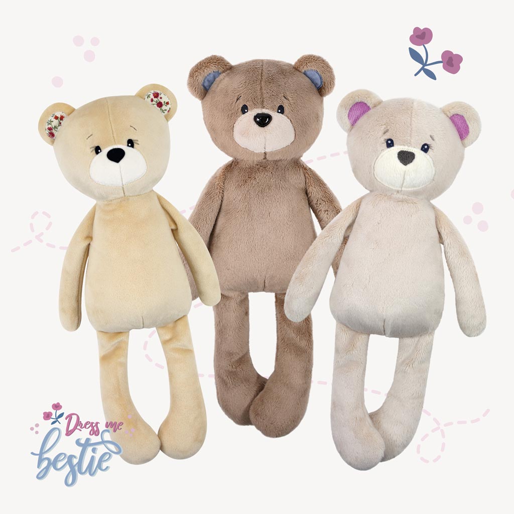 Dress Me Bestie is the name of our sewing pattern series which is all about dressing self-sewn cuddly friends. Teddy bear BETSY is 16 inch (40 cm) from head to toe and one of the characters for whom you can sew matching clothes and many great accessories – and all of them are interchangeable between the characters in the series! To sew the stuffed bear, you should have a little sewing experience and 2-3 hours of time.
