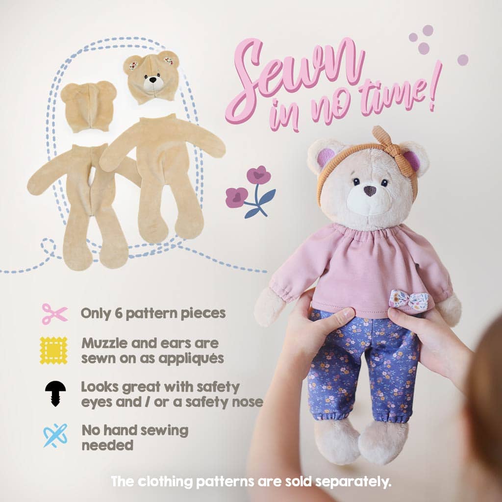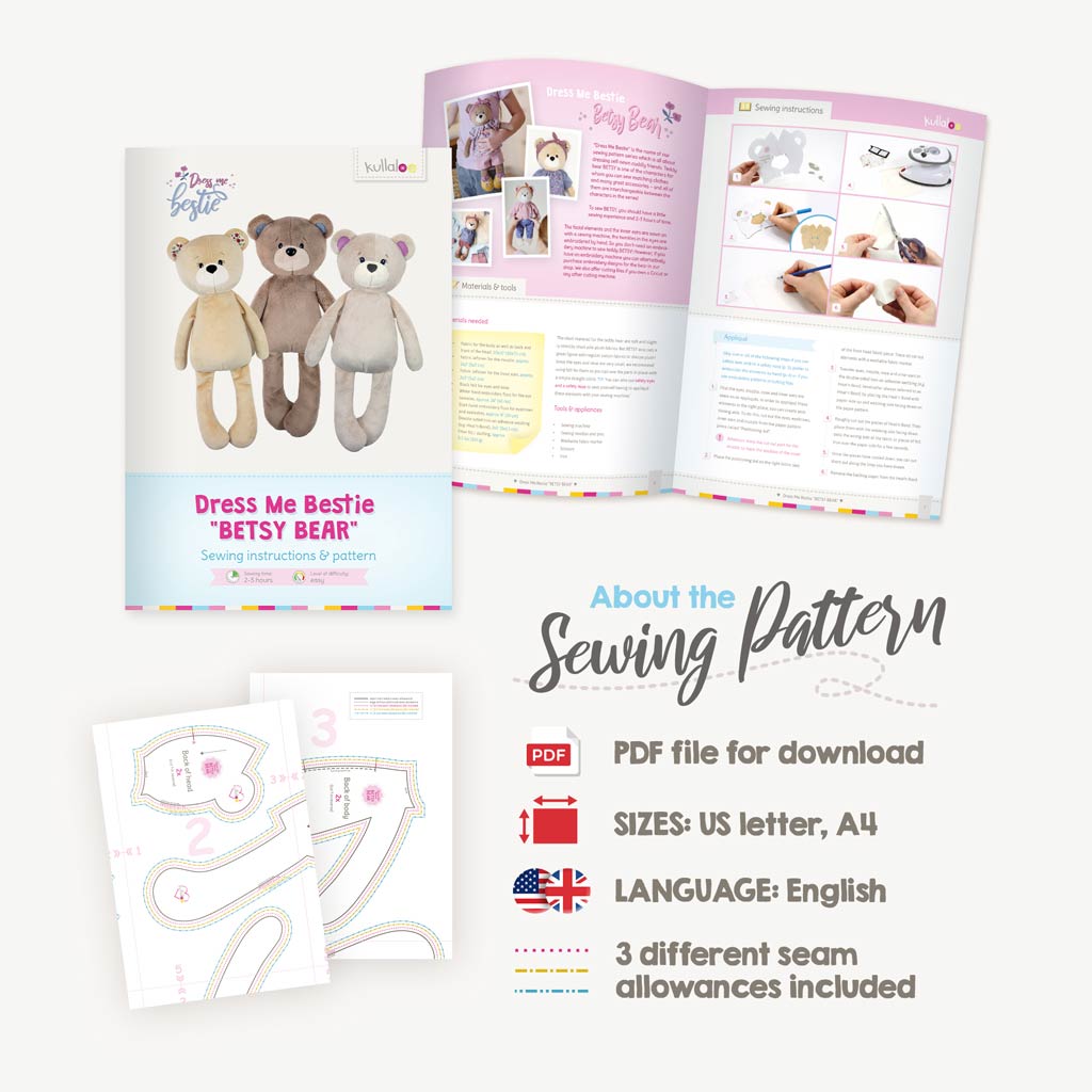 With the purchase of this PDF you will receive our teddy sewing pattern “BETSY BEAR” from our cloth doll pattern series “Dress Me Bestie”. The teddy pattern comes with 3 different seam allowances (or without a seam allowance). After purchase and payment you can download the instructions and print out the PDF sewing pattern.