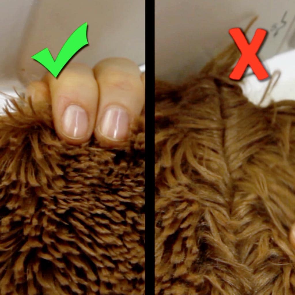 If a few piles have gotten caught in the seam and disappeared: Don’t panic, your sewing project is not lost, you can fix it with a pin! Simply grab a few fibers at a time with the pin and carefully pull them out of the seam. This requires a little patience, but afterward all the hair is where it belongs and the seam is barely visible. Check this video to see how it works: