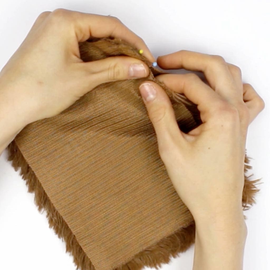 When pinning fake fur or shaggy fabrics, the same applies as with any plush fabric: don’t skimp on pins! The more pins, the cleaner the sewing result will be. However, there is one thing you should pay particular attention to when pinning long-piled plush: the long pile fibers must be pushed between the layers of fabric when pinning! When you’re done pinning, there shouldn’t be any hairs sticking out. With this trick you can easily prevent hairs from being sewn in and then having to be laboriously pulled out of the seam again. Use lots of pins so that plush fibers don’t slip out again.