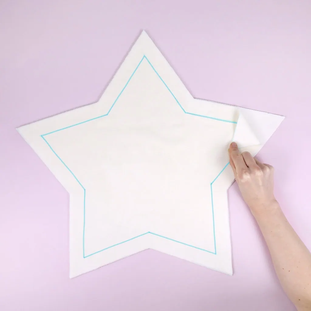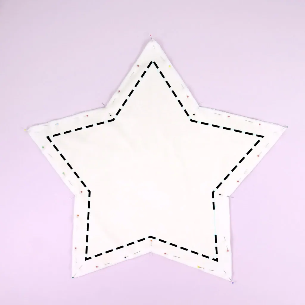 Place the two star pieces wrong sides together and pin them in place. Sew around the edges with a 1¼” (3 cm) seam allowance. The seam line is marked in light gray on the paper pattern piece (in the photos, you’ll see it marked in blue). Remember to leave an opening for stuffing the pillow!