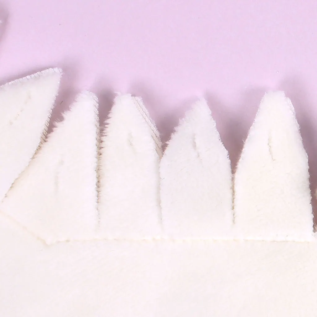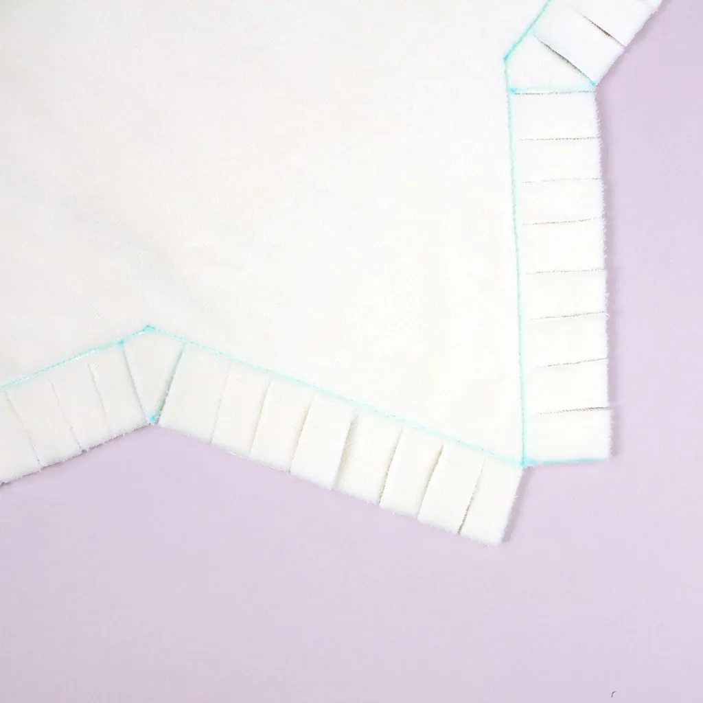 At each of the five corners, trim the seam allowance so that there’s a right angle on either side of the corner. Then, as shown in the picture, cut the seam allowance into even strips, all the way up to the seam line. Each star point should have about eight fringe strips. The inner corners will naturally create a pointed fringe.